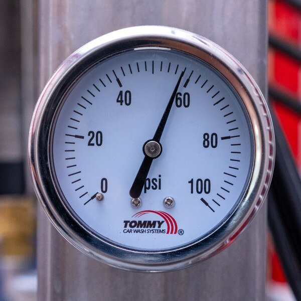 The Pressure Gauge is a crucial component for monitoring the low-pressure systems within the All-In-One Pump Station of a car wash. This gauge provides an accurate and easy-to-read measurement of pressure within a range of 0-100 PSI, which is essential for ensuring the proper function of various chemical and water lines.